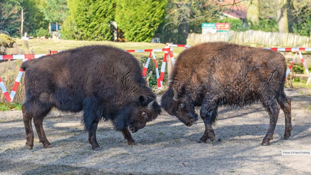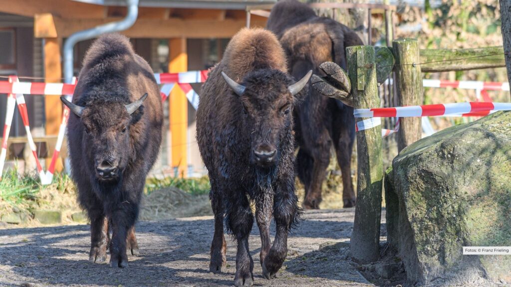 „Der neue Bulle war zunächst vorsichtig, erkundete aber neugierig das Gelände und nahm gleich ein Bad im Teich“, berichtet Zootierärztin und Kuratorin Dr. Heike Weber. Nachdem sich die Nordhorner Bisonkuh Nala problemlos verladen ließ, konnte der Integrationsprozess beginnen. Revierleiter Henning Meyer beobachtete erste Rangordnungskämpfe, wie sie unter Bisons üblich sind: „Kopfschlagen und Käbbeleien sind normal – sie dienen der Klärung der Hierarchie in der Herde.“