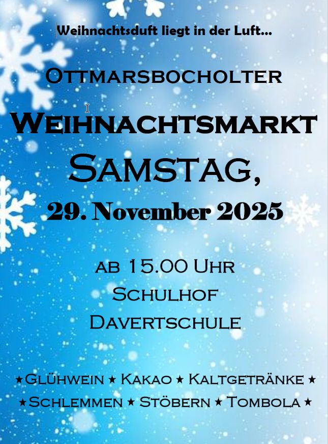 In Ottmarsbocholt lädt der Förderverein der Davertschule ab 15 Uhr zu einem stimmungsvollen Weihnachtsmarkt auf dem Schulhof ein. Neben Kulinarik und Ständen mit Geschenkideen gibt es auch dort eine Tombola. Der Erlös unterstützt die schulische Arbeit.