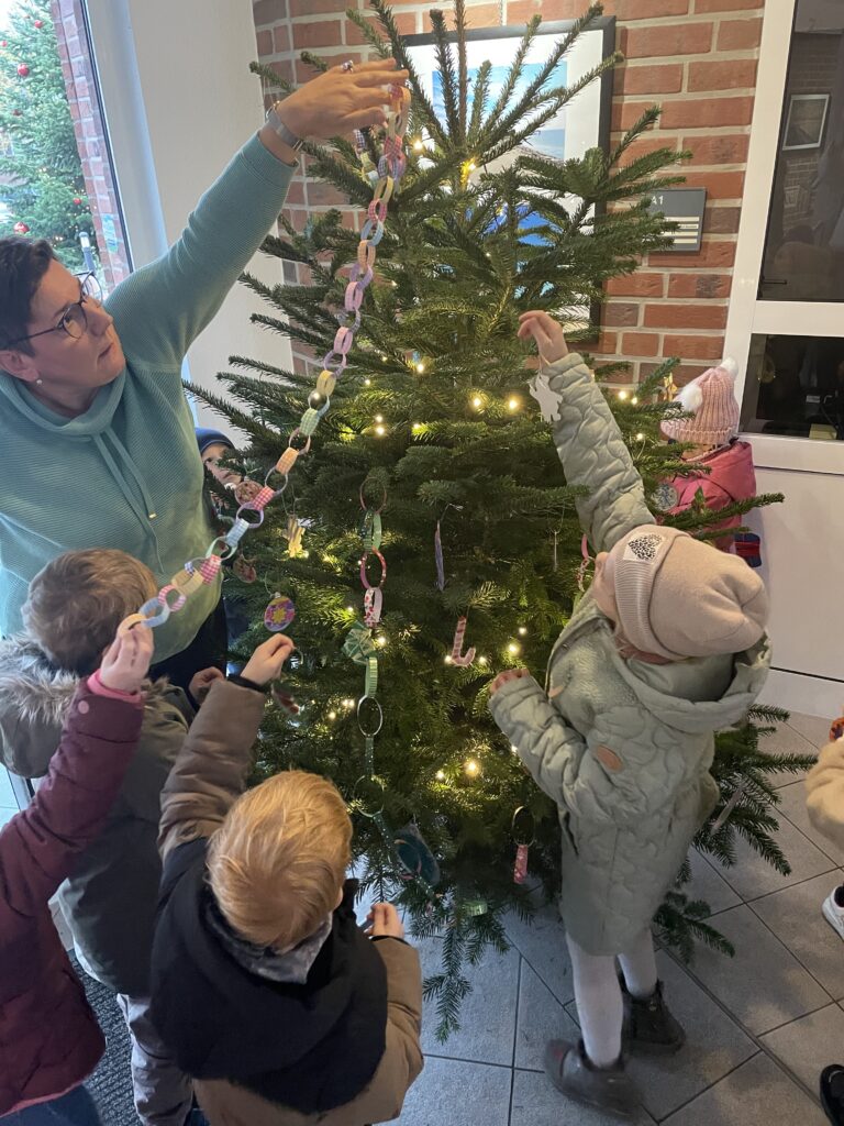 Zum Abschluss versammelten sich alle Beteiligten vor dem fertig geschmückten Baum. Gemeinsam stimmten Kinder und Erwachsene das Adventslied „Oh Tannenbaum“ an. Die feierliche Atmosphäre markierte den offiziellen Beginn der Vorweihnachtszeit im Geester Rathaus. Als Dankeschön für die Mühe und den liebevoll gestalteten Schmuck erhielten die Kinder kleine Überraschungen, die ihnen den Start in den Advent zusätzlich versüßten.