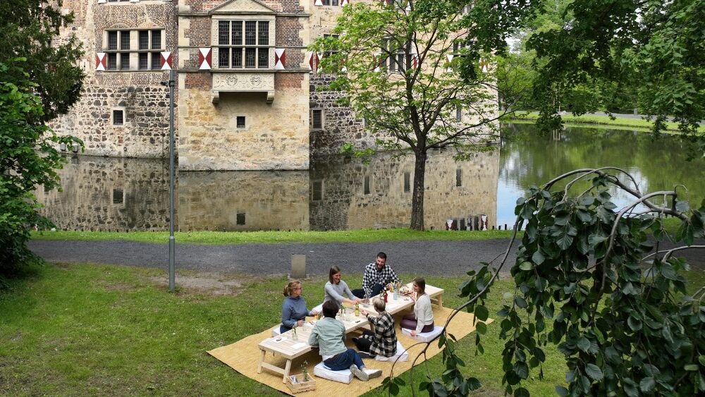Wer noch nach einem besonderen Weihnachtsgeschenk sucht, findet bei der Familienbildungsstätte Lüdinghausen eine außergewöhnliche Idee: Die beliebten Picknick-Kurse an der Burg Vischering gehen 2026 in die nächste Runde. An vier Terminen – 20. Mai, 23. Juni, 30. Juli und 25. August – lädt Kursleiterin Heike Hoppe zum gemütlichen Abend an der Burggräfte ein. In der historischen Burgküche bereiten die Teilnehmenden gemeinsam kreative Snacks wie Kartoffelwaffeln zu, bevor das Picknick mit Blick auf die mittelalterliche Wasserburg genossen wird. Die Veranstaltung kostet 55 Euro inklusive Lebensmittelumlage und findet in Kooperation mit dem Münsterland-Siegel statt. Anmeldungen sind ab sofort unter www.fbs-luedinghausen.de möglich.