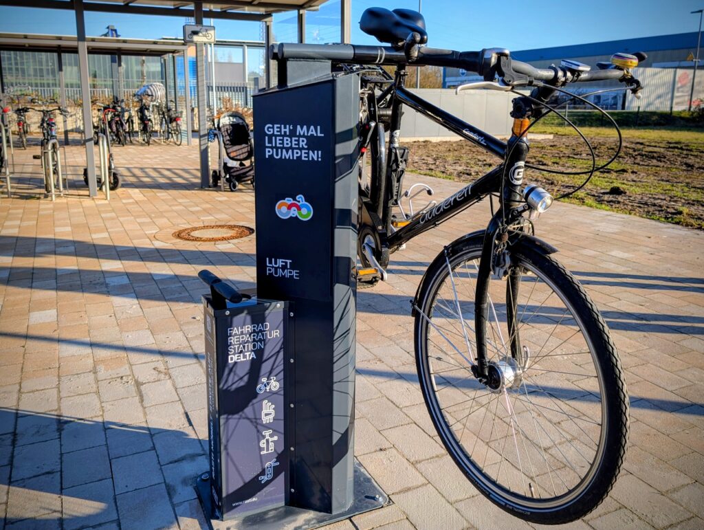 Neben den neuen Boxen steht eine Fahrrad-Servicestation bereit. Sie ist mit den gängigsten Werkzeugen wie Maul- und Innensechskantschlüsseln, Reifenhebern und Schraubendrehern ausgestattet, die über Stahlseile gesichert sind. Eine manuell bedienbare Luftpumpe sowie eine Aufhängemöglichkeit erleichtern kleine Reparaturen unterwegs.