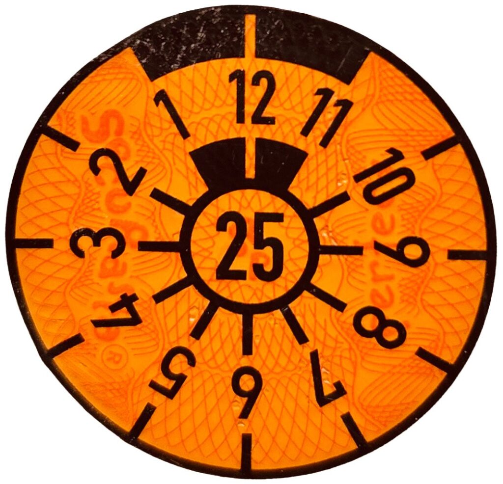Die orangefarbene Prüfplakette mit der Zahl 25 auf dem hinteren Kennzeichen zeigt das Ablaufjahr für die Hauptuntersuchung von Fahrzeugen wie Autos, Anhängern oder Motorrädern an. Die genaue Fälligkeit bestimmt der Monat, die an der Plakette durch eine Zahl oben angezeigt wird. Zum Beispiel bedeutet die Zahl 12, dass die Untersuchung im Dezember fällig ist. Fahrzeughalter sind verpflichtet, die Hauptuntersuchung bis zum Ablaufdatum durchführen zu lassen, um Bußgelder und Probleme mit Versicherungen zu vermeiden.