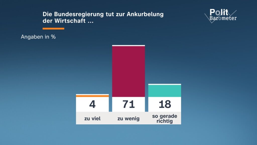 Die unzufriedene Haltung gegenüber der Wirtschaftspolitik der Bundesregierung bleibt hoch: 71 Prozent der Befragten halten die Maßnahmen für unzureichend. Zudem werden die Europäische Union und ihre wirtschaftliche Bedeutung für Deutschland von 81 Prozent als sehr wichtig oder wichtig eingestuft.