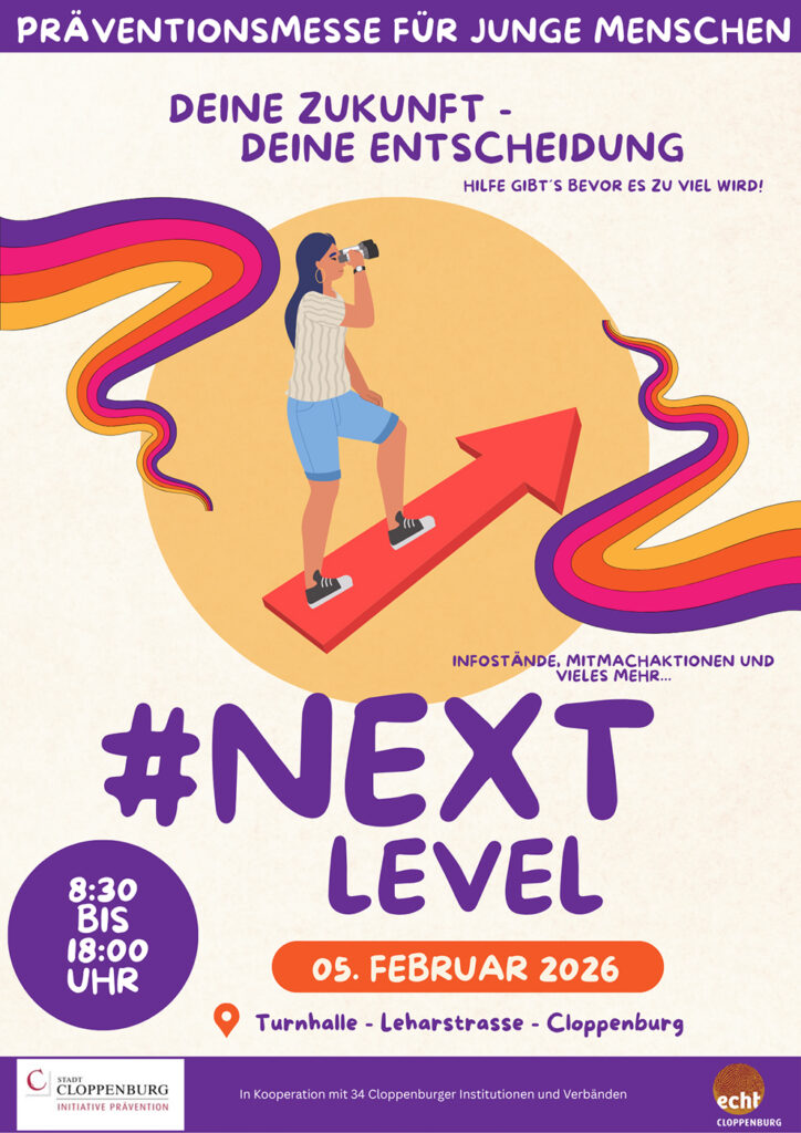 Die „Initiative Prävention“ der Stadt Cloppenburg organisiert mit der Präventionsmesse „#nextlevel: Deine Zukunft – deine Entscheidung“ eine zentrale Informationsplattform für Jugendliche und Fachkräfte. Insgesamt präsentieren sich 34 Anlaufstellen und Organisationen aus Cloppenburg und dem Landkreis. Das Angebot umfasst Einrichtungen aus Jugendhilfe, Beratungsstellen, Polizei, Bildungsträger sowie ehrenamtliche und kirchliche Organisationen.