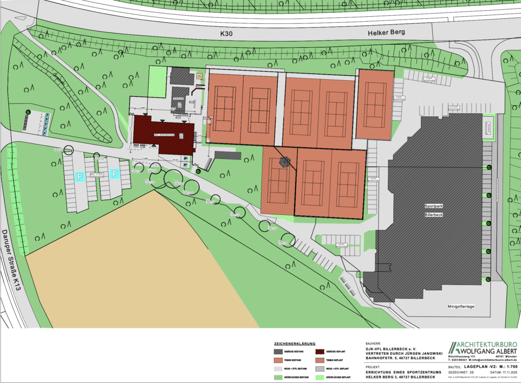 Die Stadt Billerbeck beabsichtigt, mit der 5. Änderung des Bebauungsplans „Sportzentrum Helker Berg“ die Voraussetzungen für die Errichtung des neuen Sportzentrums des DJK-VfL Billerbeck zu schaffen. Neben dem Gelände für das Sportzentrum soll auch das Parkplatzangebot erweitert werden, um den Anforderungen an eine moderne Sportstätte gerecht zu werden.