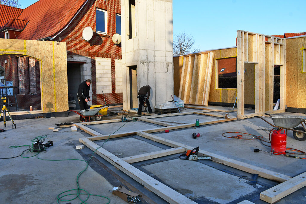 „Seit letzter Woche stellt das Bauunternehmen die vorgefertigten Wandelemente auf, der Fahrstuhlschacht steht auch schon. Bis zum Sommer soll die Mensa fertig sein“, teilte die Stadt Cloppenburg mit.