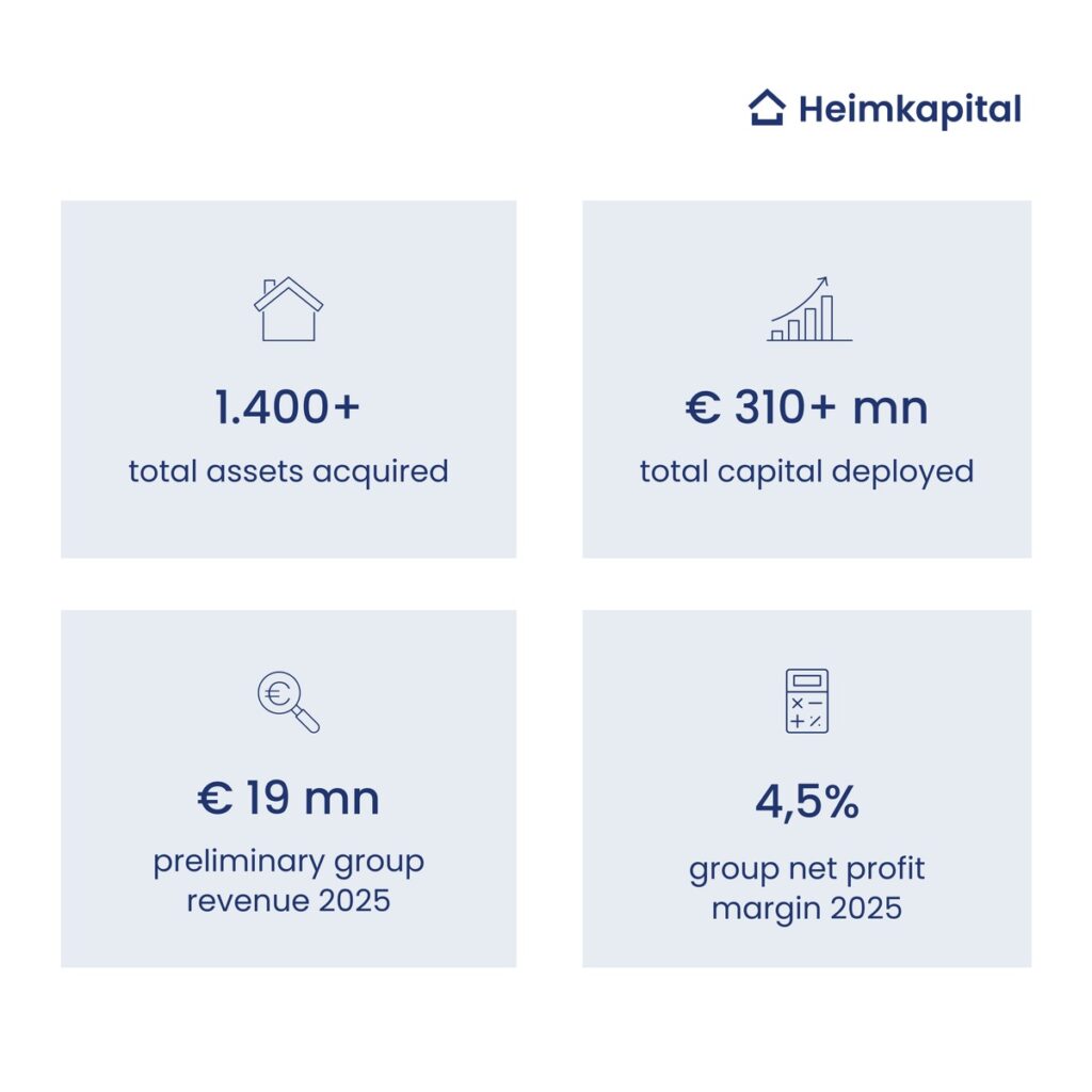 München. Das Münchner Unternehmen Heimkapital stärkt seine wirtschaftliche Stabilität und erzielt 2025 ein profitables Wachstum. Mit einem Transaktionsvolumen von rund 60 Millionen Euro und einem verwalteten Immobilienvermögen von etwa 700 Millionen Euro baut Heimkapital sein Geschäft weiter aus.