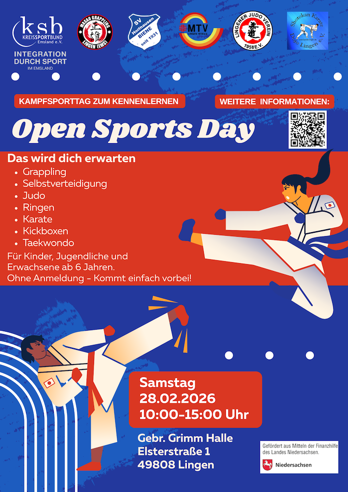 Lingen. Der Open Sports Day Lingen lädt am Samstag, 28. Februar 2026, dazu ein, verschiedene Kampfsportarten unverbindlich kennenzulernen und auszuprobieren. Die Veranstaltung wird vom KreisSportBund Emsland zusammen mit fünf Lingener Sportvereinen organisiert.