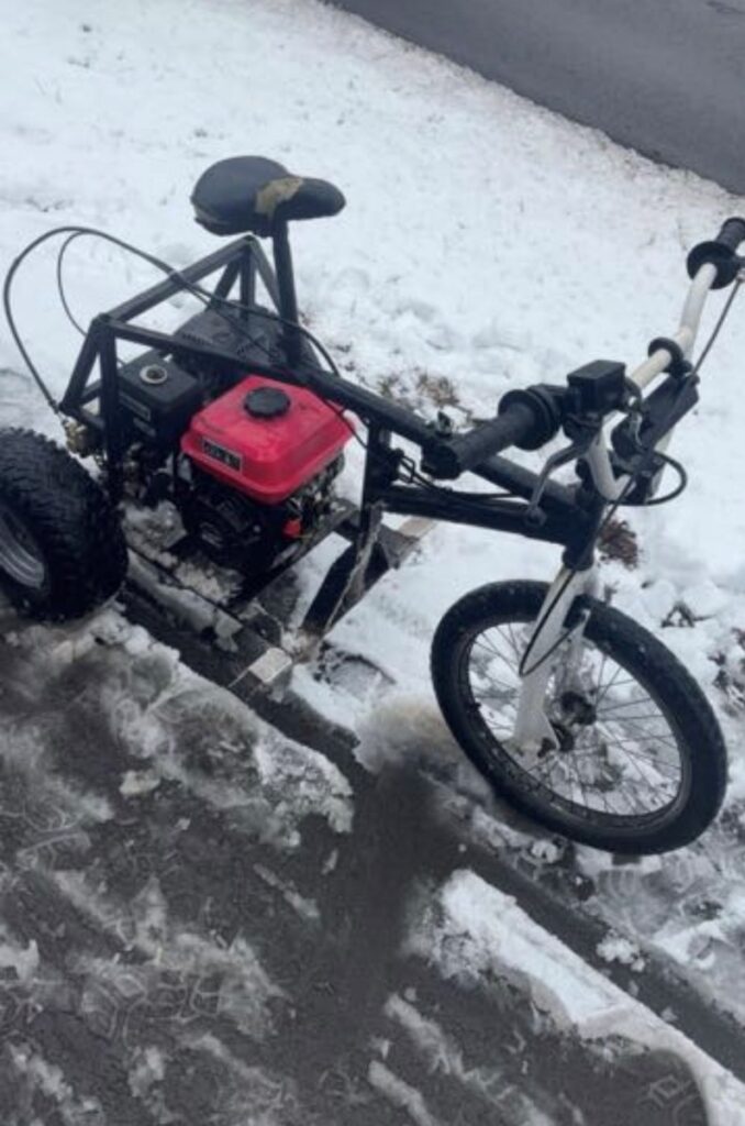 Im Rahmen der Kontrollen wurde auch ein 15-jähriger Jugendlicher aus Barßel überprüft. Er fuhr ein an ein BMX-Fahrrad angebautes Trike-ähnliches Fahrzeug mit einem Rasenmähermotor, das etwa 55 km/h erreichte. Dieses Fahrzeug verfügte weder über einen Versicherungsschutz noch war es für den Straßenverkehr zugelassen. Der Jugendliche versuchte zunächst, sich der Kontrolle durch Flucht zu entziehen und gab bei der Überprüfung falsche Personalien an.