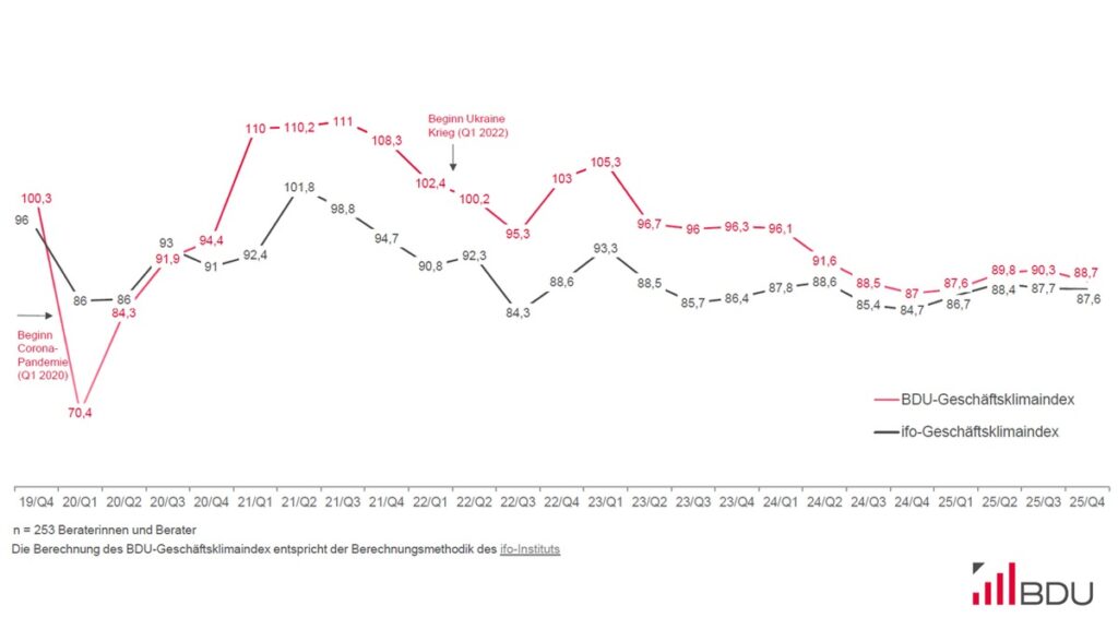 Bonn. Der geschäftsklimaindex consulting 2025 zeigt im vierten Quartal eine leicht rückläufige Seitwärtsbewegung mit einem Wert von 88,7. Trotz dieser Entwicklung blicken deutlich mehr Beratungsunternehmen zuversichtlich auf das kommende Jahr und erwarten günstigere Geschäftsaussichten.