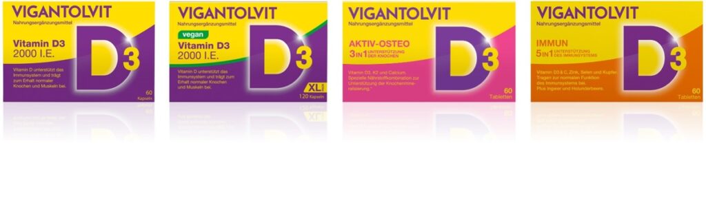 Beispielsweise bietet das Produkt Vigantolvit® verschiedene Darreichungsformen mit 2000 I.E. Vitamin D an, etwa vegane Weichkapseln aus Algen, Weichgummis mit Zitronengeschmack oder Öle zur genaueren Dosierung. Zudem gibt es spezielle Kombinationen für Frauen über 50, die auch Vitamin K2 und Calcium enthalten.