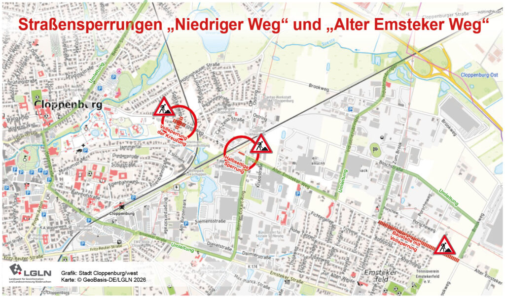 Am 12. Februar beginnen umfangreiche Bauarbeiten an der Kreuzung Niedriger Weg / Speckenweg / Eisenbahnstraße. Diese Kreuzung wird bis voraussichtlich Ende April komplett gesperrt. Eine neue Ampelanlage wird installiert und die Fahrbahndecke erneuert. Die Maßnahme zielt darauf ab, die Verkehrssicherheit zu erhöhen, da die Kreuzung als Unfallschwerpunkt bekannt ist. Die Stadt Cloppenburg richtet eine ausgeschilderte Umleitung ein, die unter anderem über die B 72 und den Alten Emsteker Weg führt. Fußgänger können ihre Grundstücke weiterhin erreichen, Anwohner müssen jedoch während der Bauarbeiten mit Einschränkungen bei der Fahrzeugzufahrt rechnen.