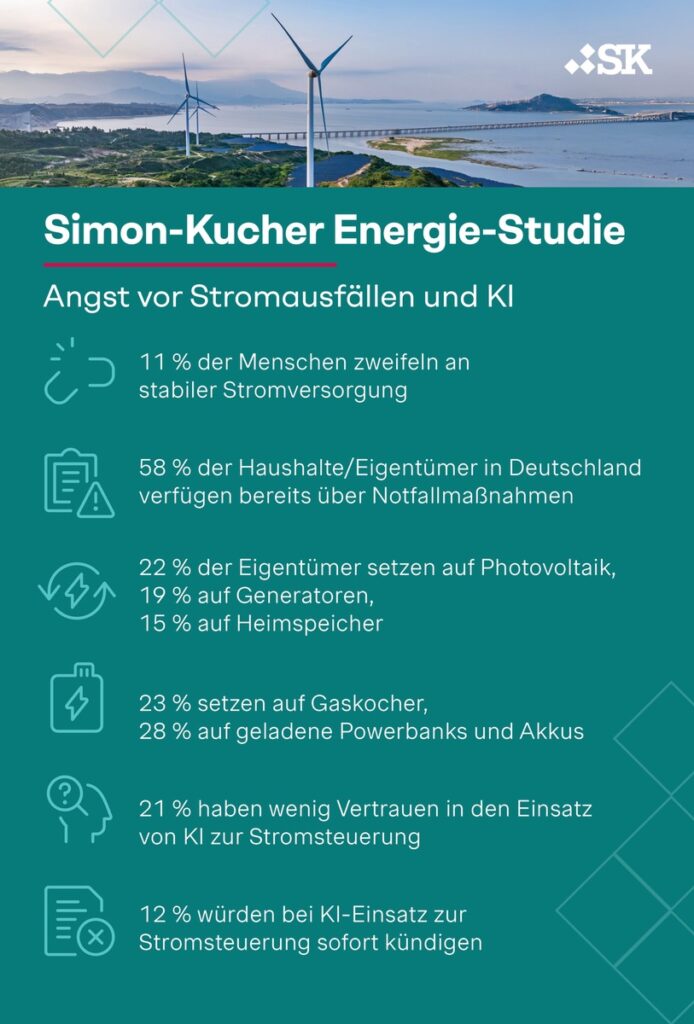 Köln. Laut der aktuellen Simon-Kucher Energie-Studie äußert jede zehnte Person in Deutschland Zweifel an einer stabilen Stromversorgung. Trotz bestehender Schutzmaßnahmen sind aktuell 58 Prozent der Haushalte auf mögliche Notfälle und Überlastungen vorbereitet.