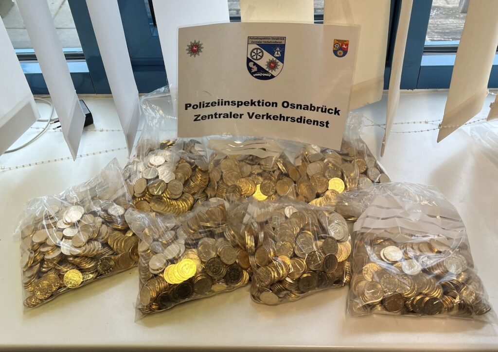 Die Kontrolle der Polizei Osnabrück erfolgte am Dienstagvormittag auf der Autobahn 30 in Fahrtrichtung Hannover. Beamte des Zentralen Verkehrsdienstes überprüften einen Kleinwagen mit niederländischer Zulassung, dessen Insassen widersprüchliche Angaben zu Fahrtzweck und Reiseziel machten. Bei der Durchsuchung fanden die Einsatzkräfte drei Beutel mit Münzen unter den Sitzen des Fahrzeugs.