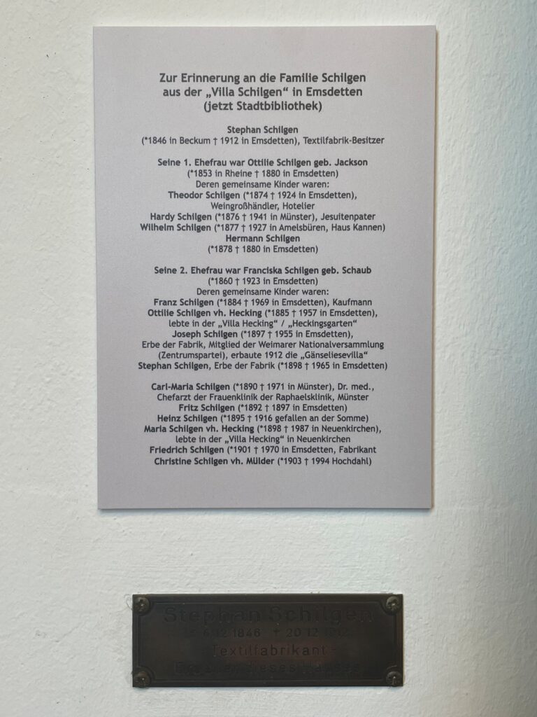 Die Stadtbibliothek befindet sich in der so genannten Villa Schilgen, die vom Erbauer Stephan Schilgen errichtet wurde. Um die Erinnerung an die Familie lebendig zu halten, wurde jetzt eine Informations-Tafel mit der Überschrift „Zur Erinnerung an die Familie Schilgen aus der ‚Villa Schilgen‘“ installiert. Die Tafel zeigt Namen und Geburtsdaten von Stephan Schilgen, seinen Ehefrauen Ottilie und Franciska Schilgen sowie dessen 14 Kindern aus beiden Ehen. Alle Kinder wurden in der Villa Schilgen geboren.