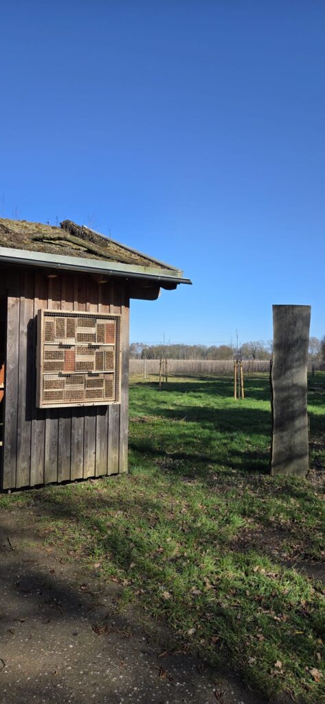 Die Schutzhütte steht auf einer Obstbaumwiese, die als Ausgleichsfläche dient und von der Stiftung Büngerner-Dingdener Heide errichtet wurde. Weitere Insektenhotels sind im Naturschutzgebiet geplant, um den Lebensraum für Wildbienen weiter auszubauen.