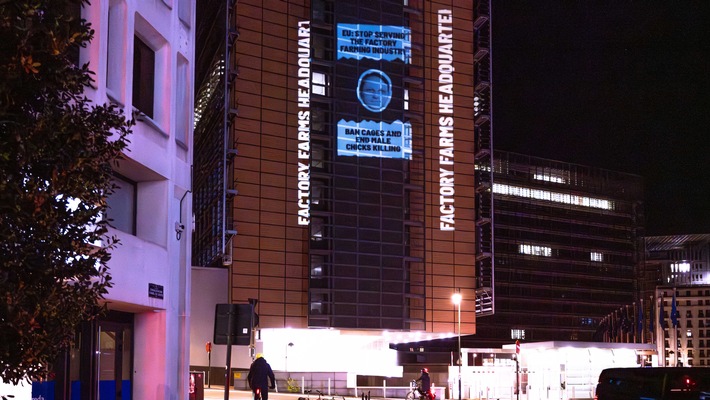 Animal Equality führte in der vergangenen Nacht eine großflächige Projektion auf das Berlaymont-Gebäude der EU-Kommission in Brüssel durch. Damit machte die Tierschutzorganisation auf den direkten Einfluss der Agrarindustrie auf die Entscheidungsträger aufmerksam, die eigentlich für den Schutz von Tieren verantwortlich sind. Insbesondere wurde darauf hingewiesen, dass die EU-Kommissare Olivér Várhelyi und Christophe Hansen wiederholt mit Vertretern der Agrarindustrie zusammenkamen, während der Austausch mit Tierschutzorganisationen kaum stattfand.