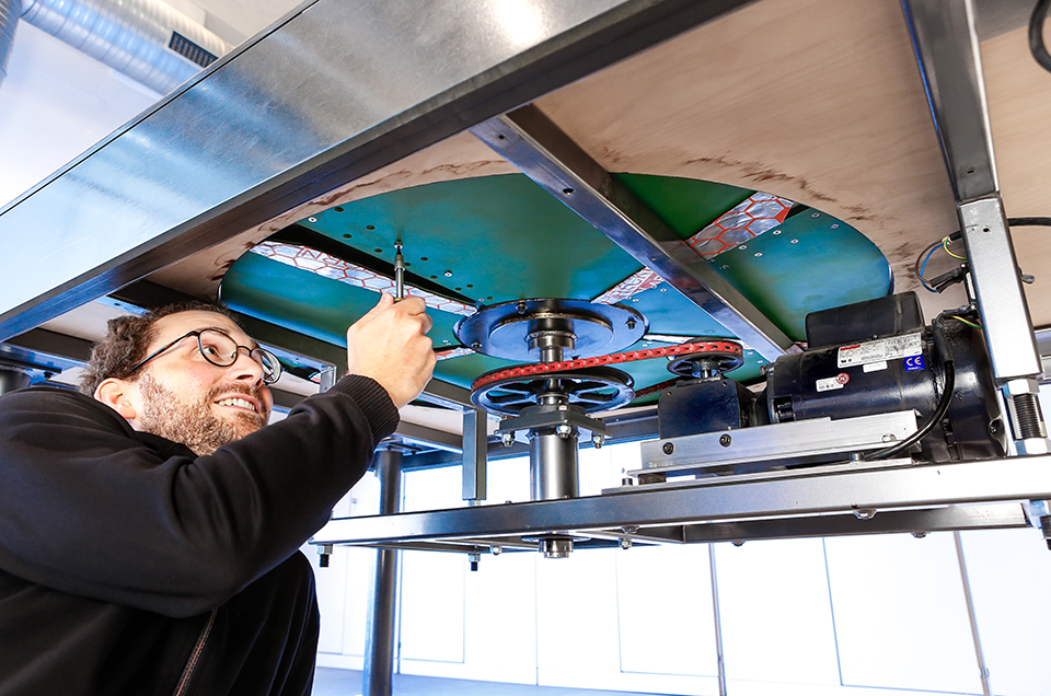 Im Phaeno-Museum Wolfsburg begeistert ein spezieller drehender Billardtisch die Besucher. Er demonstriert auf beeindruckende Weise die Corioliskraft. Wenn Besucher jedoch die Billardkugel auf die bewegte Scheibe fallen lassen, führt das zu einer störenden Geräuschkulisse, da die Drehscheibe wie ein Gong schwingt. Um dieser Herausforderung zu begegnen, haben Forschungsteams des Fraunhofer-Instituts für Betriebsfestigkeit und Systemzuverlässigkeit (LBF) eine innovative Lösung entwickelt.